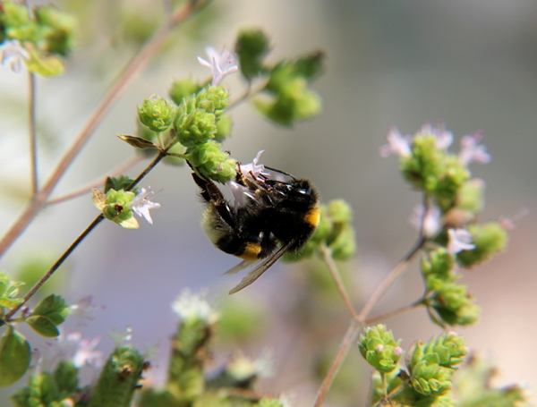 Der Gerechtigkeit halber muss ich allerdings noch eine Sache aufklären. Mein Drachenkopf auf dem Balkon grünt schon üppig und ich freue mich auf seine hübschen Blüten. Letztes Jahr hatte ich beobachtet, dass an vielen Drachenkopfblüten Löcher im Blütenkelch zu finden waren und Nektarraub vermutet. Nun, da war ich etwas voreilig. Der Fall hat sich geklärt und alle Verdächtigen konnten entlastet werden. Tatsächlich war es kein Nektarraub, sondern der große Sammeleifer meiner Heldinnen der Arbeit, der Ackerhummeln. Wenn ihr euch auf dem Foto mal genau anschaut, wo sie ihre Füßchen beim Sammeln hinsetzt, fällt schnell auf, dass die Löcher in den Blüten genau an dieser Stelle sind. Außerdem wurden die Löcher umso größer, je länger die Blüte offen war, also einfach eine Ermüdungserscheinung des Materials. Mal sehen, ob sich die Beobachtung dieses Jahr genauso zeigt.