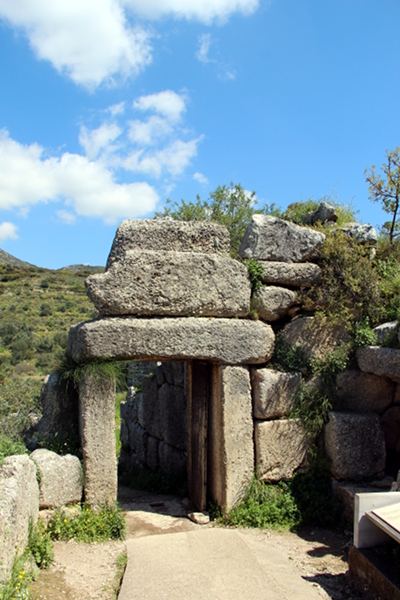 Bei näherem Hinsehen entpuppten sich die antiken Festungsmauern als reinste Bienenwand mit lauter kleinen Bienenburgen an der großen Burg. Die heutigen Bewohner des alten Mykene scheinen zu einem nicht unerheblichen Anteil Mörtelbienen sind. Allerdings war das noch nicht das eindrucksvollste Wildbienenhotel. Nach dem Museumsbesuch und ein Stück von der eigentlichen festung entfernt liegt das sogenannte Schatzhaus des Atreus – ein großes Kuppelgrab, das von von der Form her ein bisschen an einen Bienenkorb erinnert. Dunkel und kühl ist es in der Steinkuppel. Die Form des Bau erzeugen interessante Echos. In einem Augenblick, in dem sich gerade mal keine anderen Touristen außer uns in dem Bau befanden, fiel mir ein Summen auf. Es kam offenbar von den Wänden. Und tatsächlich, auch hier waren fleißige Wildbienen unterwegs, die in den Mauerritzen des Königsgrabes nisteten. Leider konnte ich sie im Dunklen nicht so genau erkennen. Mörtelbienen waren es jedenfalls nicht. Im Ausgangstor war dementsprechend ein reger Flugbetrieb, aber leider flogen die Bienchen so zielstrebig davon, dass ich sie auch dort nicht richtig vor die Linse bekam. Geheimnisvoll blieben sie für mich also, die Bewohnerinnen des vielleicht größten Wildbienenhotels der Welt.